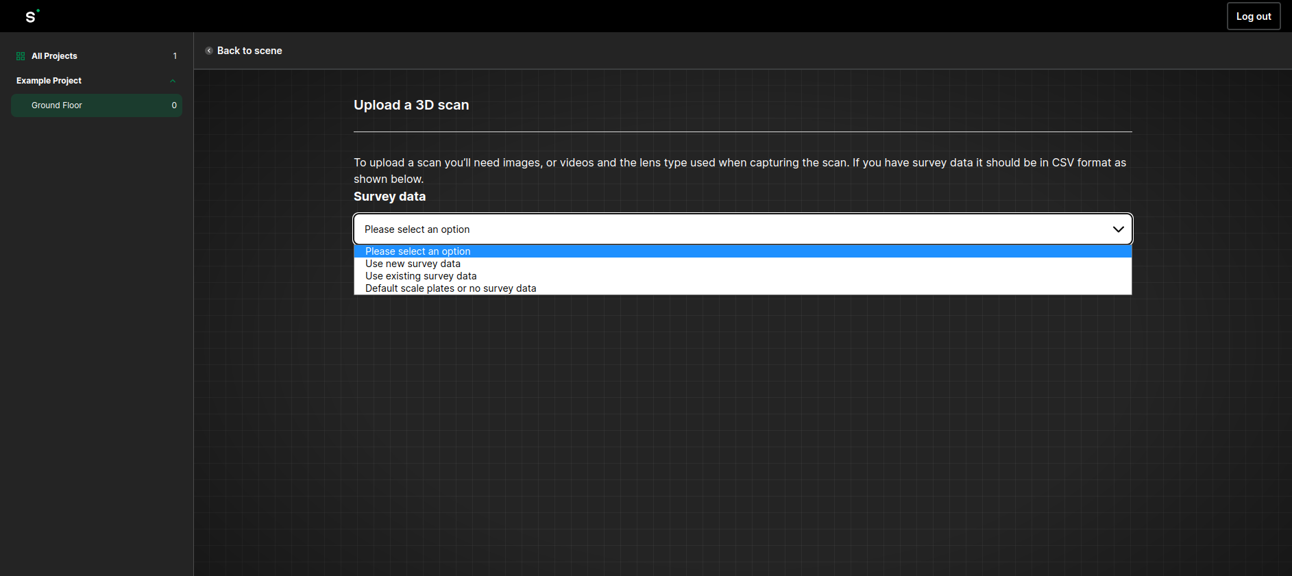 Choose the appropriate survey data option depending on whether you used the origin and scale plates, or surveyed control points.