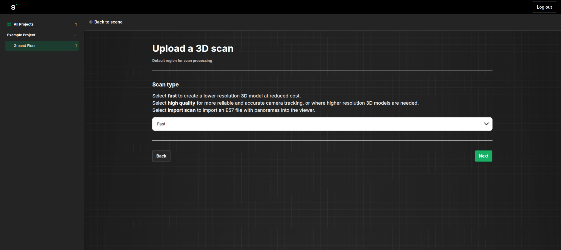 Select **Fast** or **High Quality** for the scan type depending on your needs.  The fast option provides a lower resolution 3D model and is most suitable if you only need panoramic images located on a floor map.  The high quality option should be chosen if detailed geometry is needed, and is charged at a higher rate than the fast option.