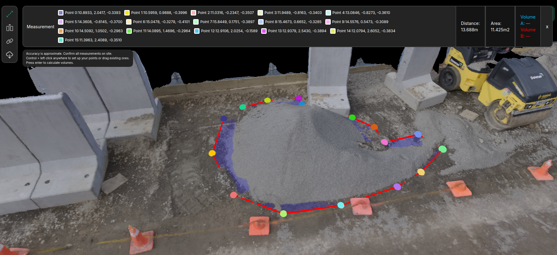 To measure a volume, first click points to define a surface.  The volume will be measured between this surface and the nearest 3D geometry.